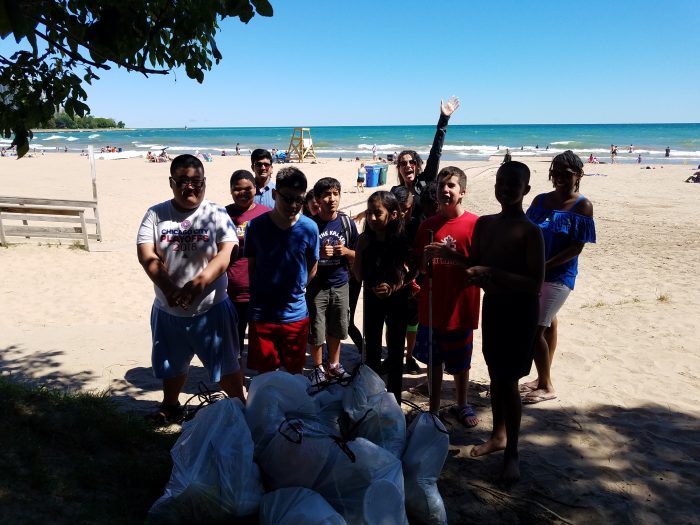 It may have taken all the restraint they could muster on the hot Friday morning, but the group of 10 to 18 year olds didn’t jump right into the water when they arrived at 10 AM. Instead they focused their energy on the task they came for: cleaning up and giving back to Foster Beach. The kids were so excited to be out on the beach — many collected trash in their swim trunks! They got to enjoy Lake Michigan after the cleanup when the lifeguards took their posts.